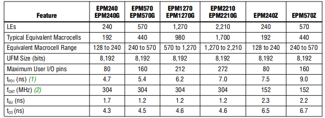 process, with densities from 240 to 2,210 logic elements (LEs) (128 to 2,210 equivalent macrocells)